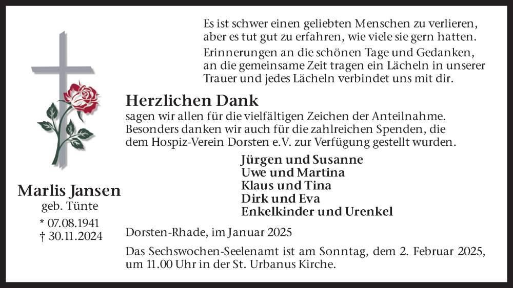 Hier finden Sie alle Traueranzeigen aus der Zeitung, die bisher für Marlis Jansen erschienen sind. Weitere Traueranzeigen, die in der Zeitung erscheinen, werden hier ebenfalls aufgelistet