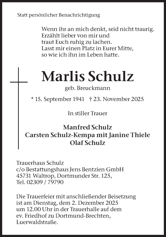 Hier finden Sie alle Traueranzeigen aus der Zeitung, die bisher für Marlis Schulz erschienen sind. Weitere Traueranzeigen, die in der Zeitung erscheinen, werden hier ebenfalls aufgelistet