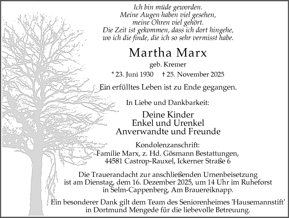 Hier finden Sie alle Traueranzeigen aus der Zeitung, die bisher für Martha Marx erschienen sind. Weitere Traueranzeigen, die in der Zeitung erscheinen, werden hier ebenfalls aufgelistet