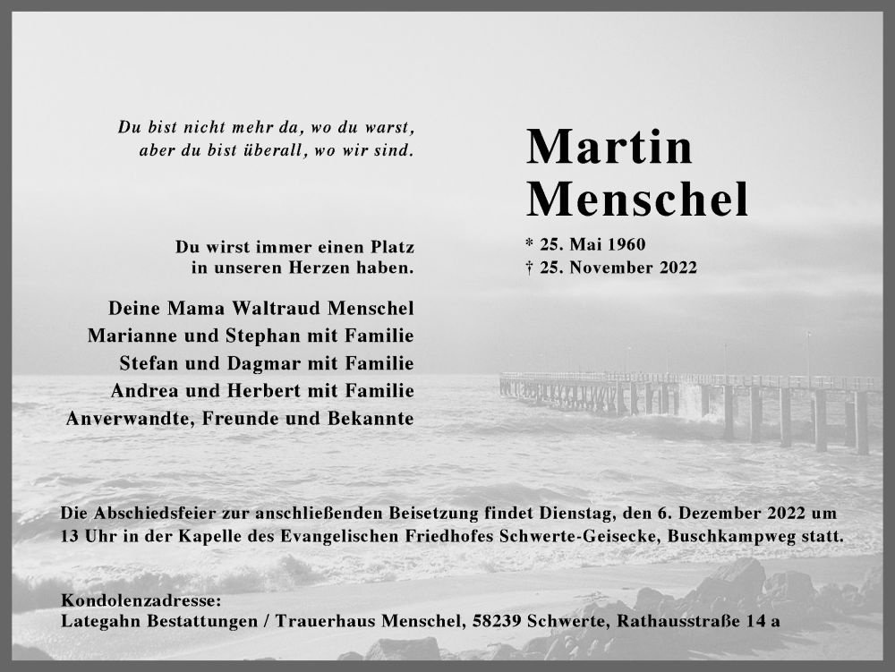 Hier finden Sie alle Traueranzeigen aus der Zeitung, die bisher für Martin Menschel erschienen sind. Weitere Traueranzeigen, die in der Zeitung erscheinen, werden hier ebenfalls aufgelistet