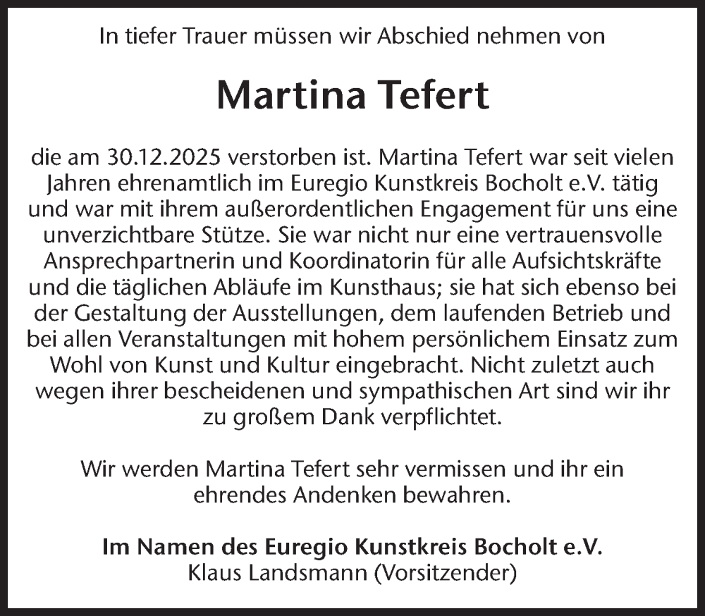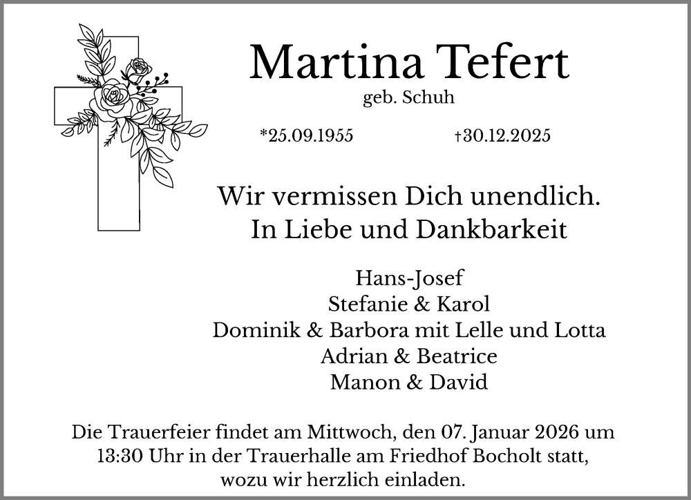 Hier finden Sie alle Traueranzeigen aus der Zeitung, die bisher für Martina Tefert erschienen sind. Weitere Traueranzeigen, die in der Zeitung erscheinen, werden hier ebenfalls aufgelistet