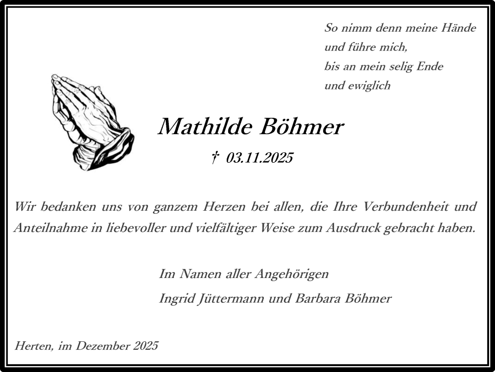 Hier finden Sie alle Traueranzeigen aus der Zeitung, die bisher für Mathilde Böhmer erschienen sind. Weitere Traueranzeigen, die in der Zeitung erscheinen, werden hier ebenfalls aufgelistet