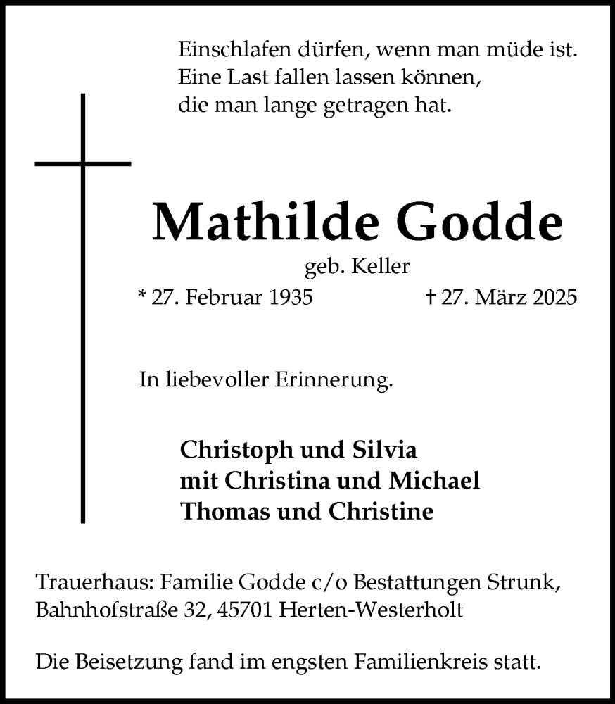 Hier finden Sie alle Traueranzeigen aus der Zeitung, die bisher für Mathilde Godde erschienen sind. Weitere Traueranzeigen, die in der Zeitung erscheinen, werden hier ebenfalls aufgelistet