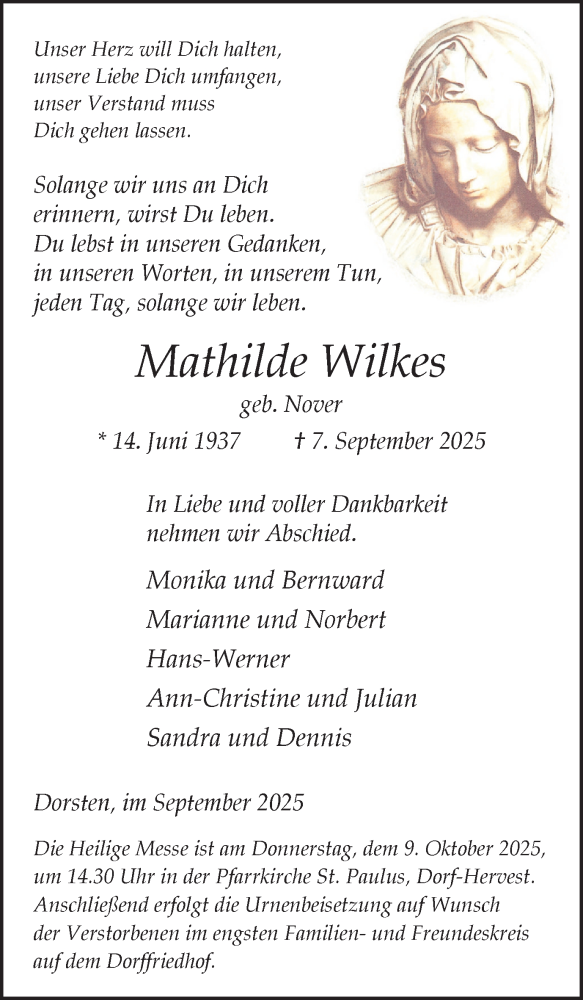 Hier finden Sie alle Traueranzeigen aus der Zeitung, die bisher für Mathilde Wilkes erschienen sind. Weitere Traueranzeigen, die in der Zeitung erscheinen, werden hier ebenfalls aufgelistet