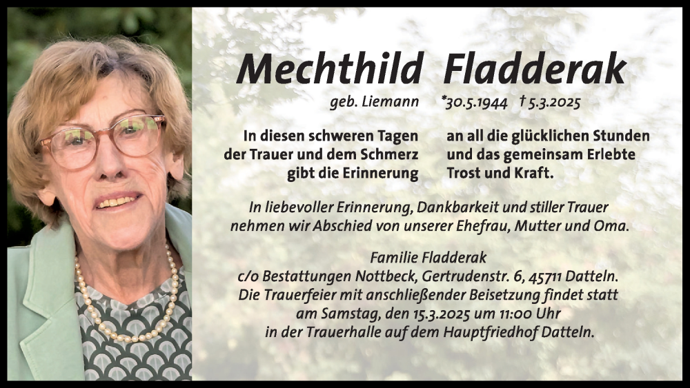 Hier finden Sie alle Traueranzeigen aus der Zeitung, die bisher für Mechthild Fladderak erschienen sind. Weitere Traueranzeigen, die in der Zeitung erscheinen, werden hier ebenfalls aufgelistet