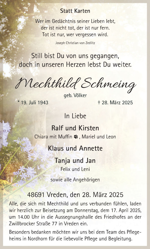 Hier finden Sie alle Traueranzeigen aus der Zeitung, die bisher für Mechthild Schmeing erschienen sind. Weitere Traueranzeigen, die in der Zeitung erscheinen, werden hier ebenfalls aufgelistet