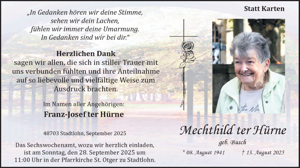 Hier finden Sie alle Traueranzeigen aus der Zeitung, die bisher für Mechthild ter Hürne erschienen sind. Weitere Traueranzeigen, die in der Zeitung erscheinen, werden hier ebenfalls aufgelistet