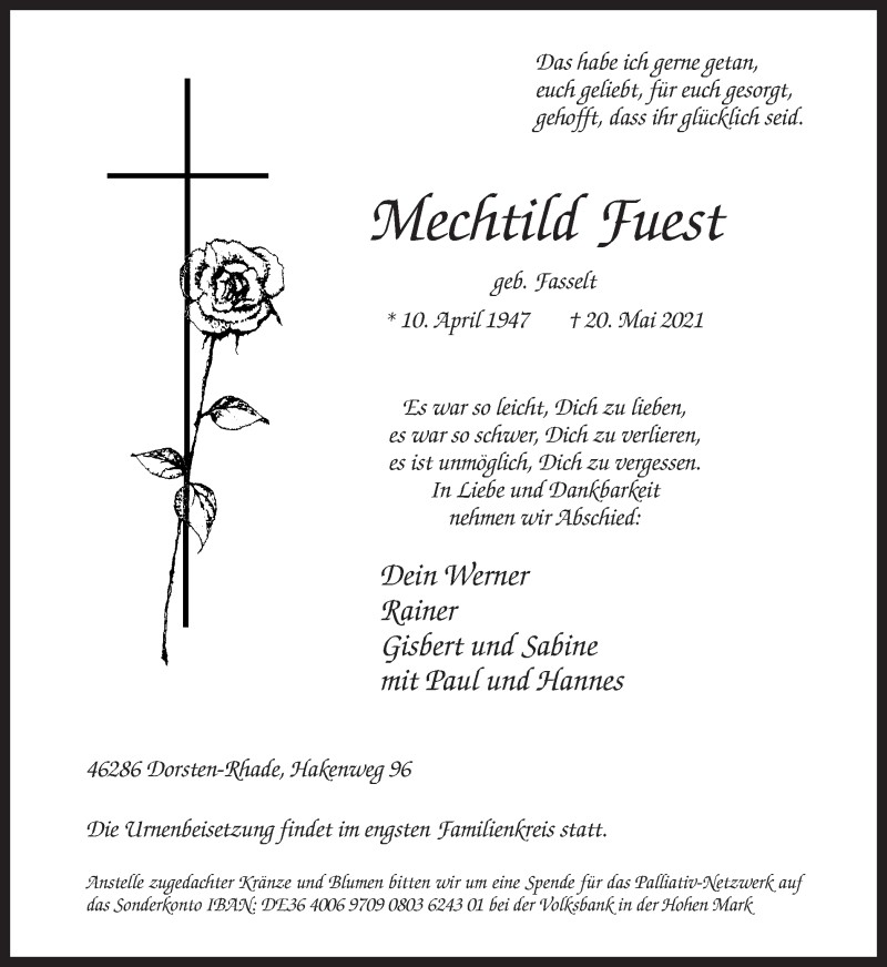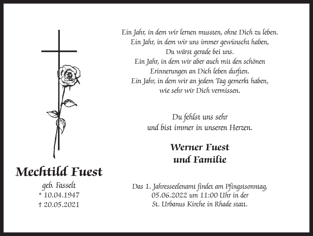 Hier finden Sie alle Traueranzeigen aus der Zeitung, die bisher für Mechtild Fuest erschienen sind. Weitere Traueranzeigen, die in der Zeitung erscheinen, werden hier ebenfalls aufgelistet