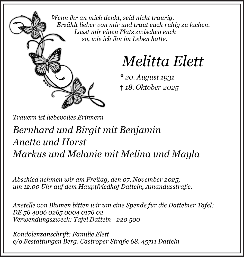Hier finden Sie alle Traueranzeigen aus der Zeitung, die bisher für Melitta Elett erschienen sind. Weitere Traueranzeigen, die in der Zeitung erscheinen, werden hier ebenfalls aufgelistet