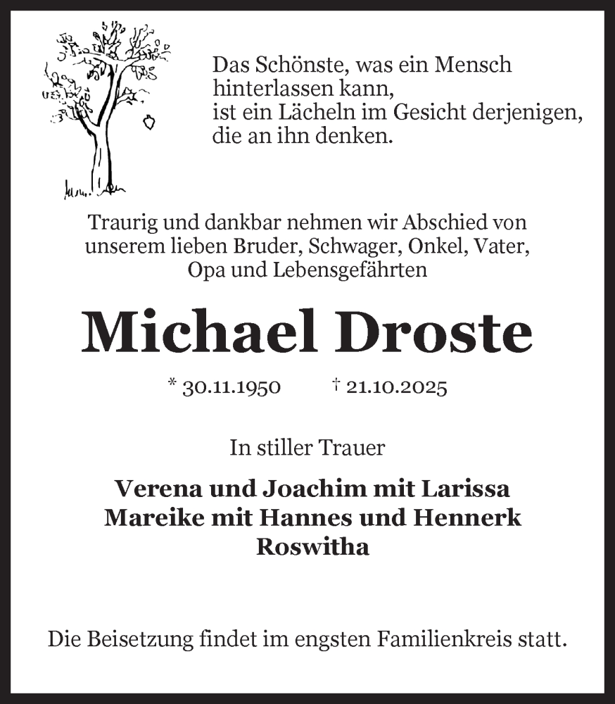 Hier finden Sie alle Traueranzeigen aus der Zeitung, die bisher für Michael Droste erschienen sind. Weitere Traueranzeigen, die in der Zeitung erscheinen, werden hier ebenfalls aufgelistet