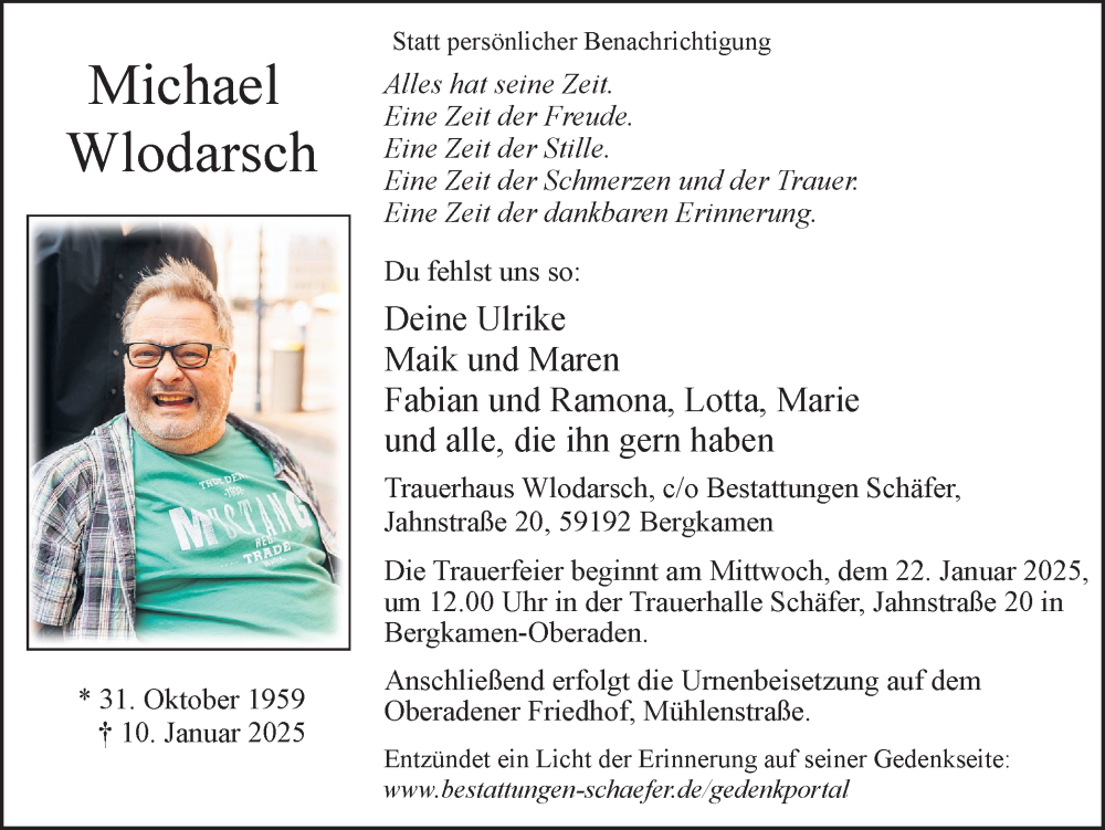 Hier finden Sie alle Traueranzeigen aus der Zeitung, die bisher für Michael Wlodarsch erschienen sind. Weitere Traueranzeigen, die in der Zeitung erscheinen, werden hier ebenfalls aufgelistet