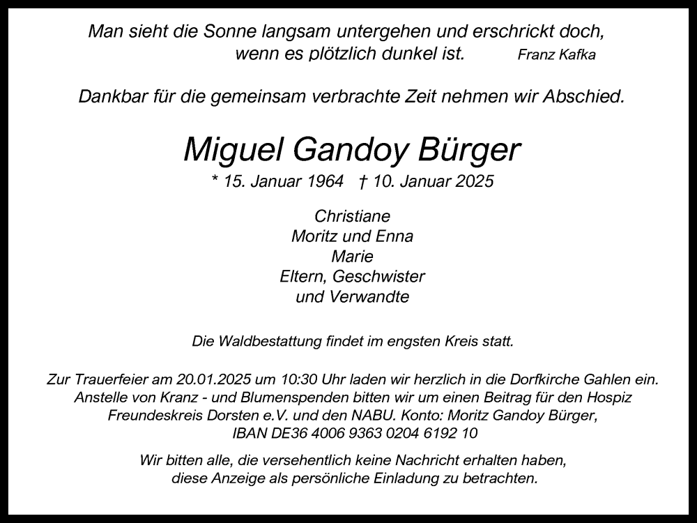 Hier finden Sie alle Traueranzeigen aus der Zeitung, die bisher für Miguel Bürger erschienen sind. Weitere Traueranzeigen, die in der Zeitung erscheinen, werden hier ebenfalls aufgelistet