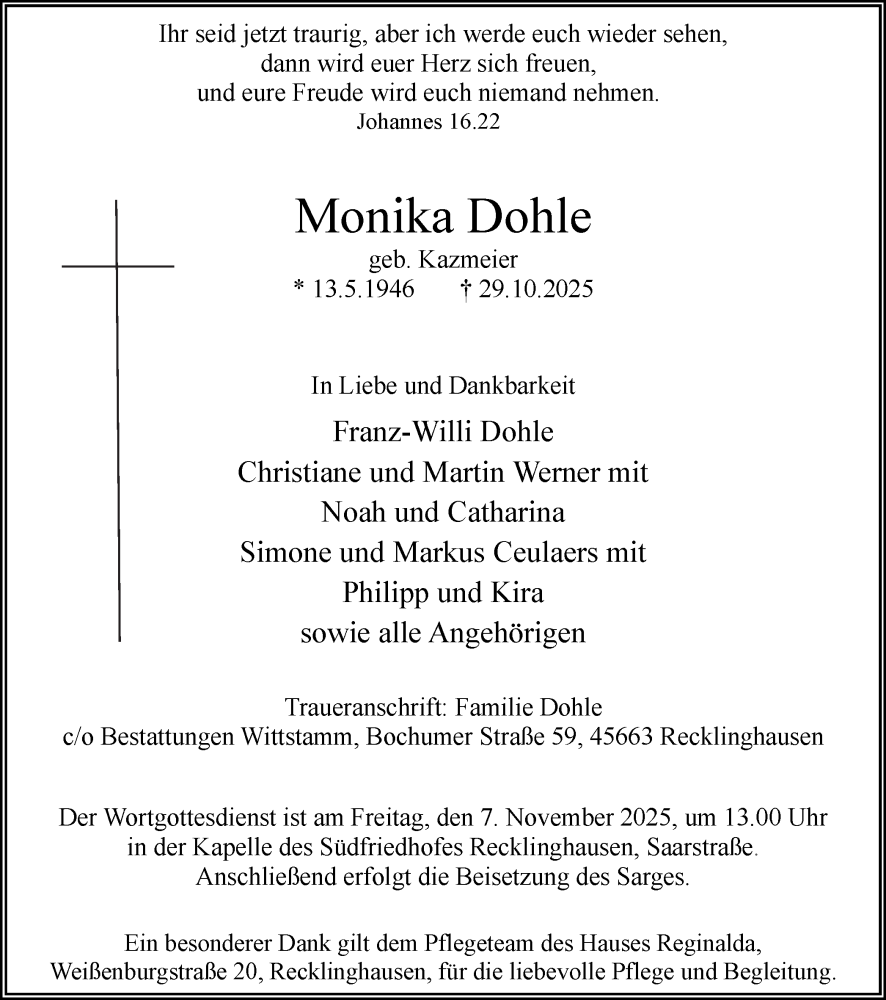Hier finden Sie alle Traueranzeigen aus der Zeitung, die bisher für Monika Dohle erschienen sind. Weitere Traueranzeigen, die in der Zeitung erscheinen, werden hier ebenfalls aufgelistet
