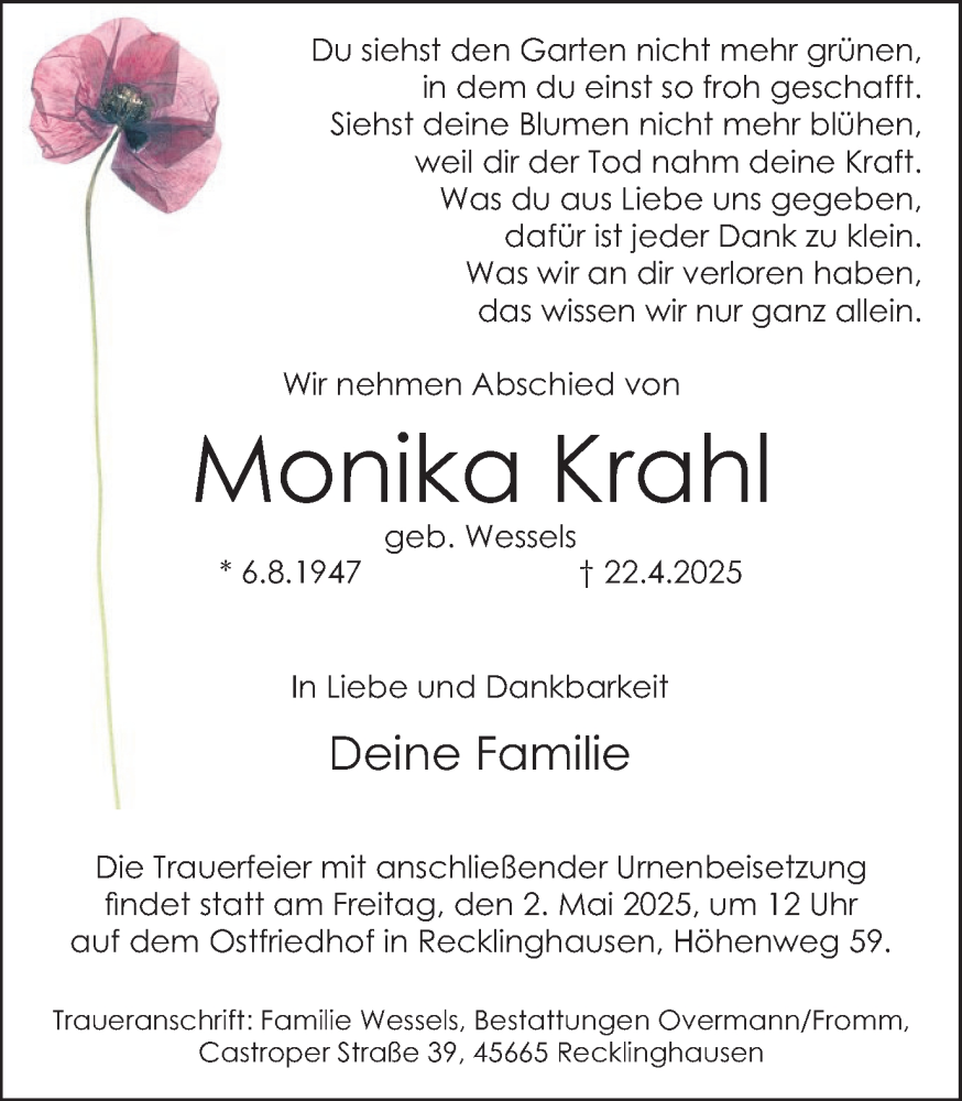 Hier finden Sie alle Traueranzeigen aus der Zeitung, die bisher für Monika Krahl erschienen sind. Weitere Traueranzeigen, die in der Zeitung erscheinen, werden hier ebenfalls aufgelistet