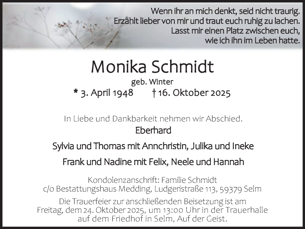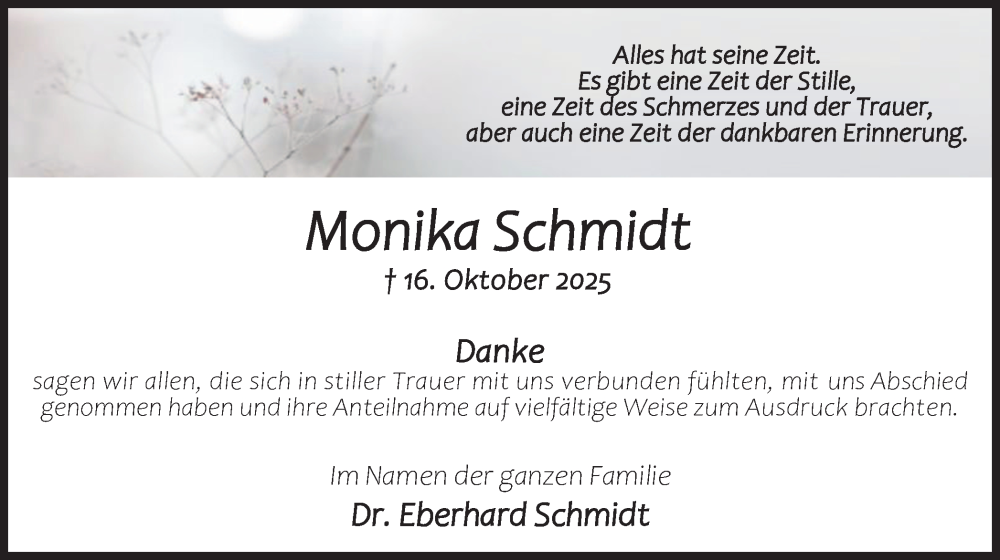 Hier finden Sie alle Traueranzeigen aus der Zeitung, die bisher für Monika Schmidt erschienen sind. Weitere Traueranzeigen, die in der Zeitung erscheinen, werden hier ebenfalls aufgelistet