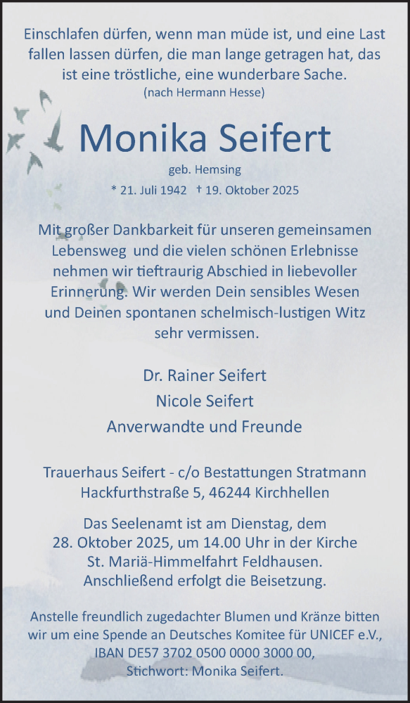 Hier finden Sie alle Traueranzeigen aus der Zeitung, die bisher für Monika Seifert erschienen sind. Weitere Traueranzeigen, die in der Zeitung erscheinen, werden hier ebenfalls aufgelistet