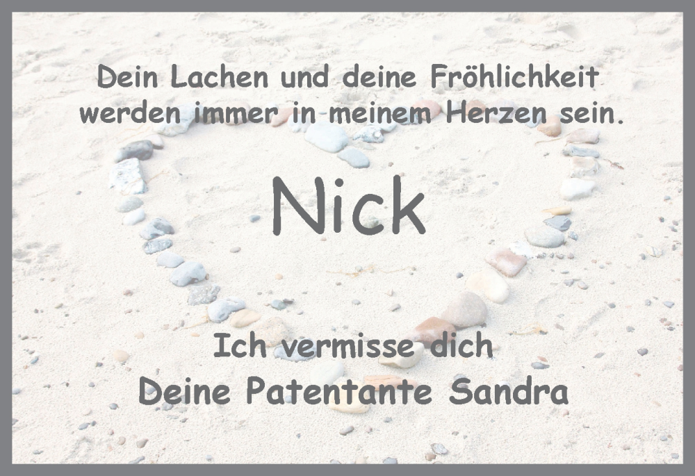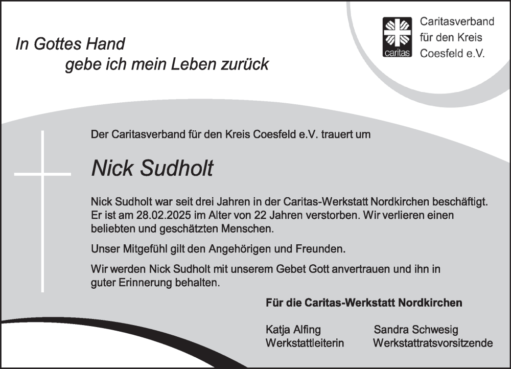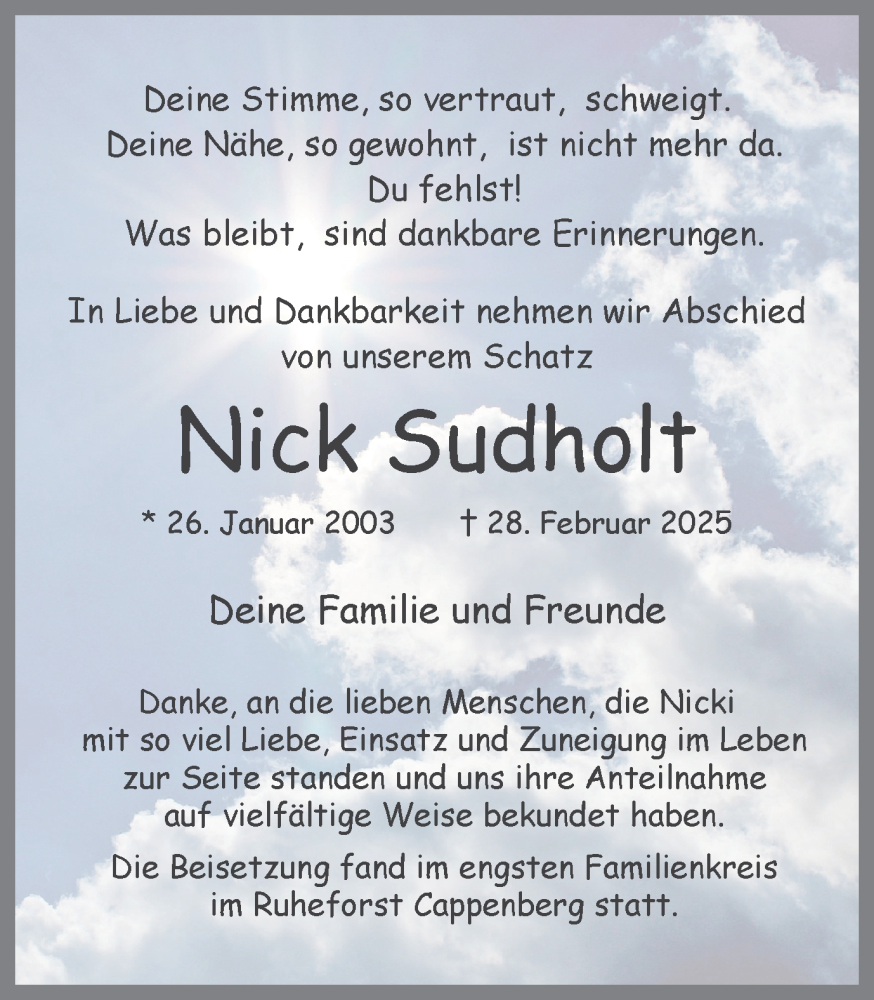 Hier finden Sie alle Traueranzeigen aus der Zeitung, die bisher für Nick Sudholt erschienen sind. Weitere Traueranzeigen, die in der Zeitung erscheinen, werden hier ebenfalls aufgelistet