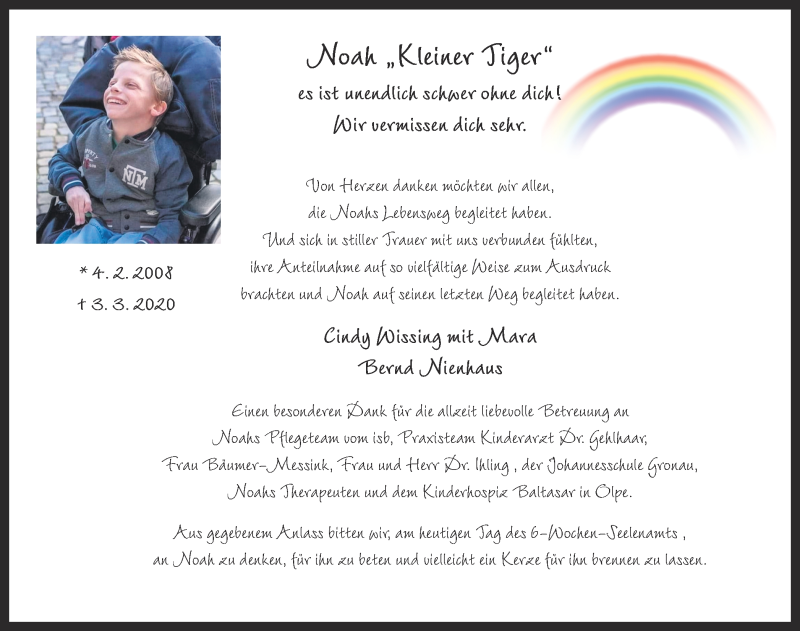 Hier finden Sie alle Traueranzeigen aus der Zeitung, die bisher für Noah Nienhaus erschienen sind. Weitere Traueranzeigen, die in der Zeitung erscheinen, werden hier ebenfalls aufgelistet