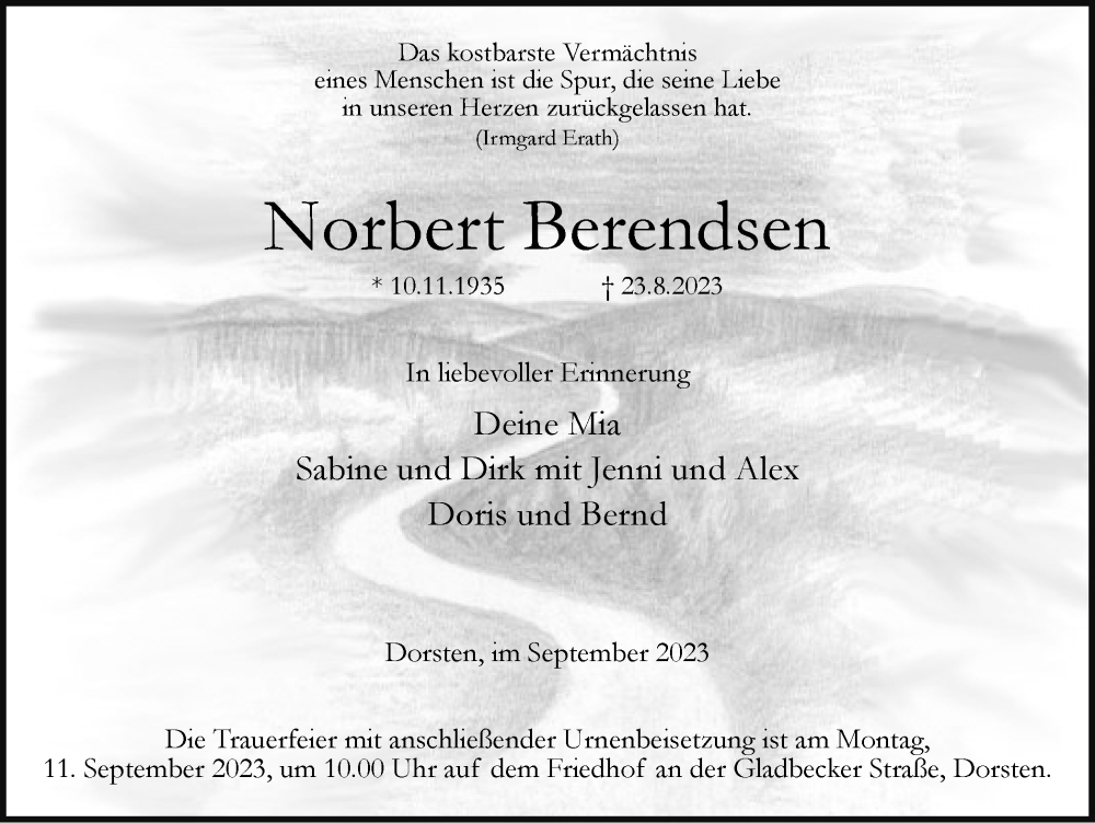 Hier finden Sie alle Traueranzeigen aus der Zeitung, die bisher für Norbert Berendsen erschienen sind. Weitere Traueranzeigen, die in der Zeitung erscheinen, werden hier ebenfalls aufgelistet