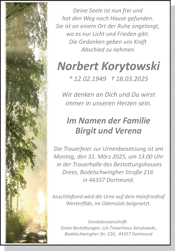 Hier finden Sie alle Traueranzeigen aus der Zeitung, die bisher für Norbert Korytowski erschienen sind. Weitere Traueranzeigen, die in der Zeitung erscheinen, werden hier ebenfalls aufgelistet
