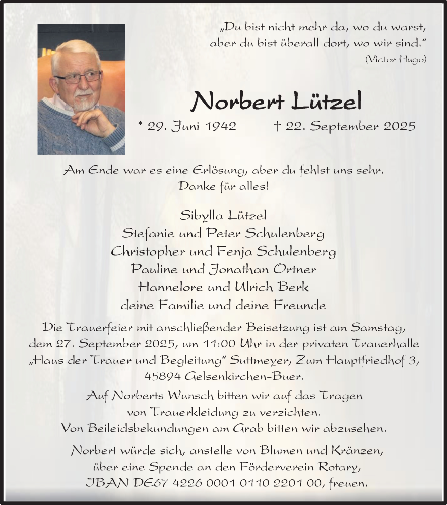 Hier finden Sie alle Traueranzeigen aus der Zeitung, die bisher für Norbert Lützel erschienen sind. Weitere Traueranzeigen, die in der Zeitung erscheinen, werden hier ebenfalls aufgelistet