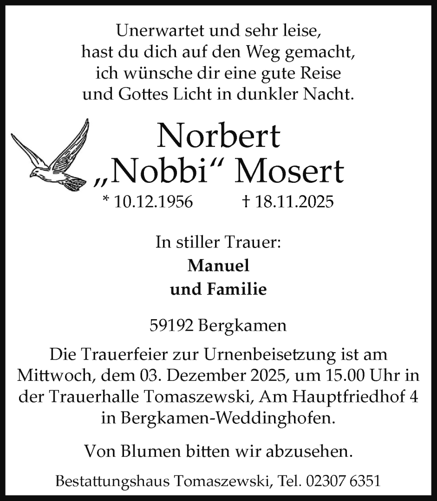 Hier finden Sie alle Traueranzeigen aus der Zeitung, die bisher für Norbert Mosert erschienen sind. Weitere Traueranzeigen, die in der Zeitung erscheinen, werden hier ebenfalls aufgelistet