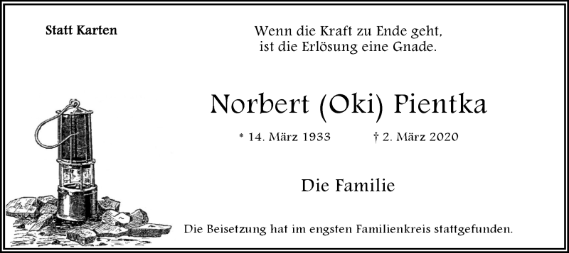 Hier finden Sie alle Traueranzeigen aus der Zeitung, die bisher für Norbert Pientka erschienen sind. Weitere Traueranzeigen, die in der Zeitung erscheinen, werden hier ebenfalls aufgelistet