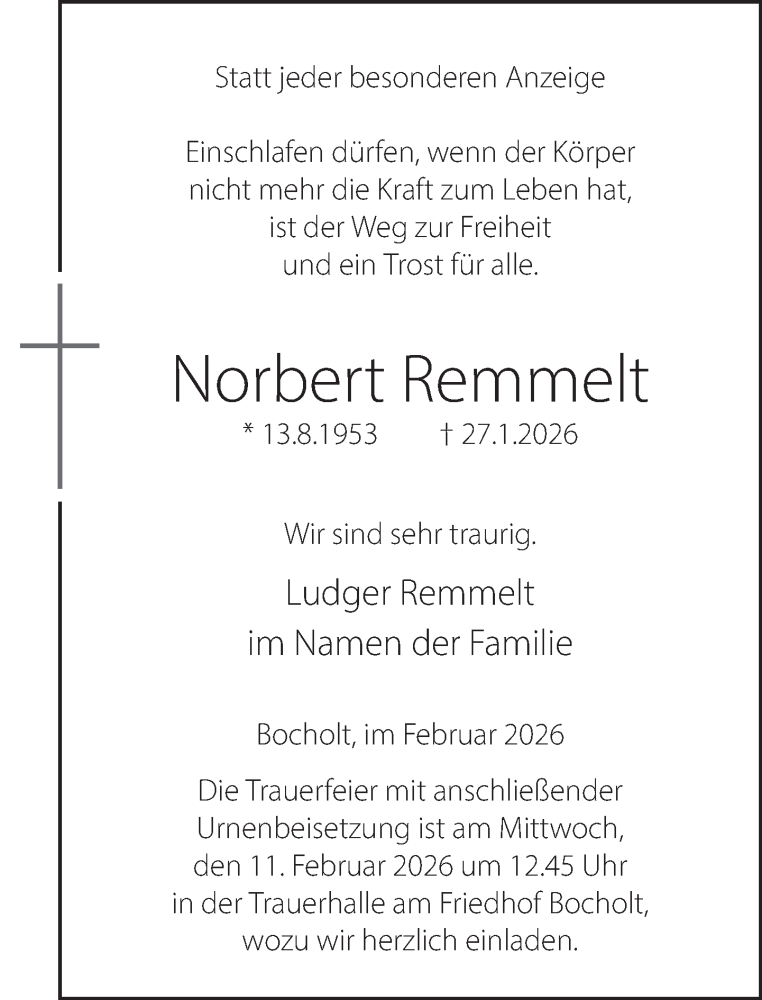 Hier finden Sie alle Traueranzeigen aus der Zeitung, die bisher für Norbert Remmelt erschienen sind. Weitere Traueranzeigen, die in der Zeitung erscheinen, werden hier ebenfalls aufgelistet