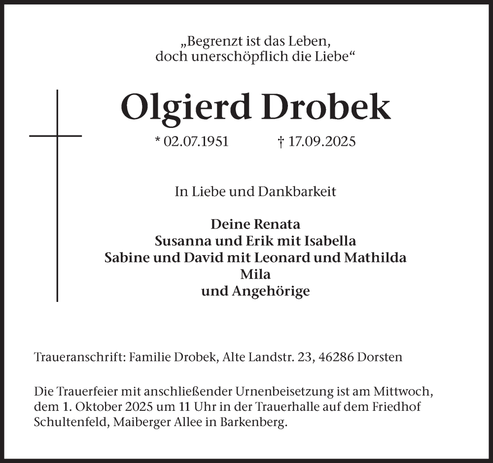 Hier finden Sie alle Traueranzeigen aus der Zeitung, die bisher für Olgierd Drobek erschienen sind. Weitere Traueranzeigen, die in der Zeitung erscheinen, werden hier ebenfalls aufgelistet