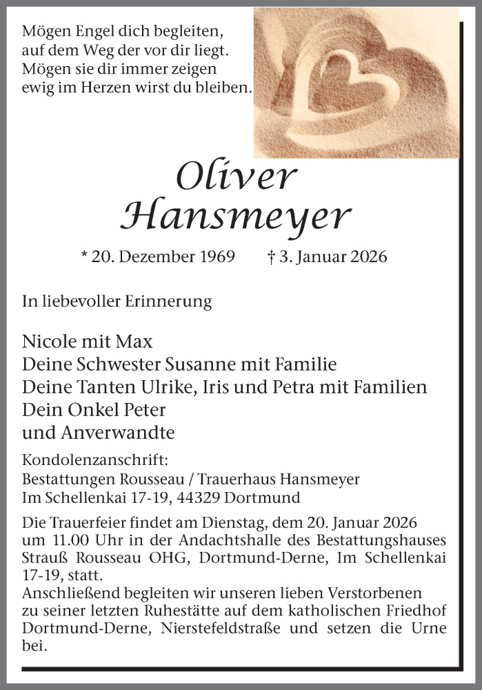 Hier finden Sie alle Traueranzeigen aus der Zeitung, die bisher für Oliver Hansmeyer erschienen sind. Weitere Traueranzeigen, die in der Zeitung erscheinen, werden hier ebenfalls aufgelistet