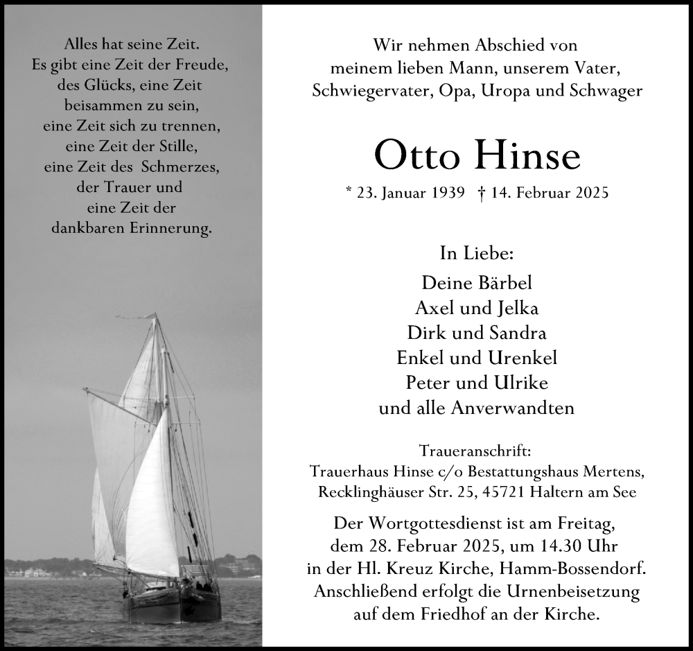 Hier finden Sie alle Traueranzeigen aus der Zeitung, die bisher für Otto Hinse erschienen sind. Weitere Traueranzeigen, die in der Zeitung erscheinen, werden hier ebenfalls aufgelistet