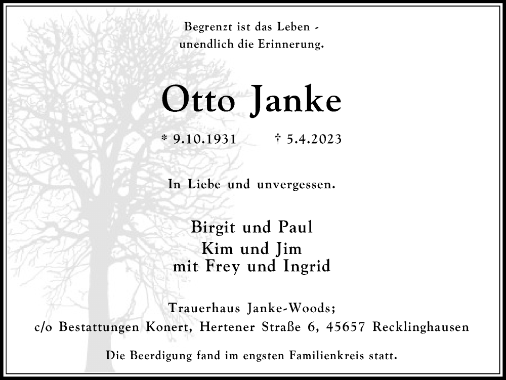 Hier finden Sie alle Traueranzeigen aus der Zeitung, die bisher für Otto Janke erschienen sind. Weitere Traueranzeigen, die in der Zeitung erscheinen, werden hier ebenfalls aufgelistet
