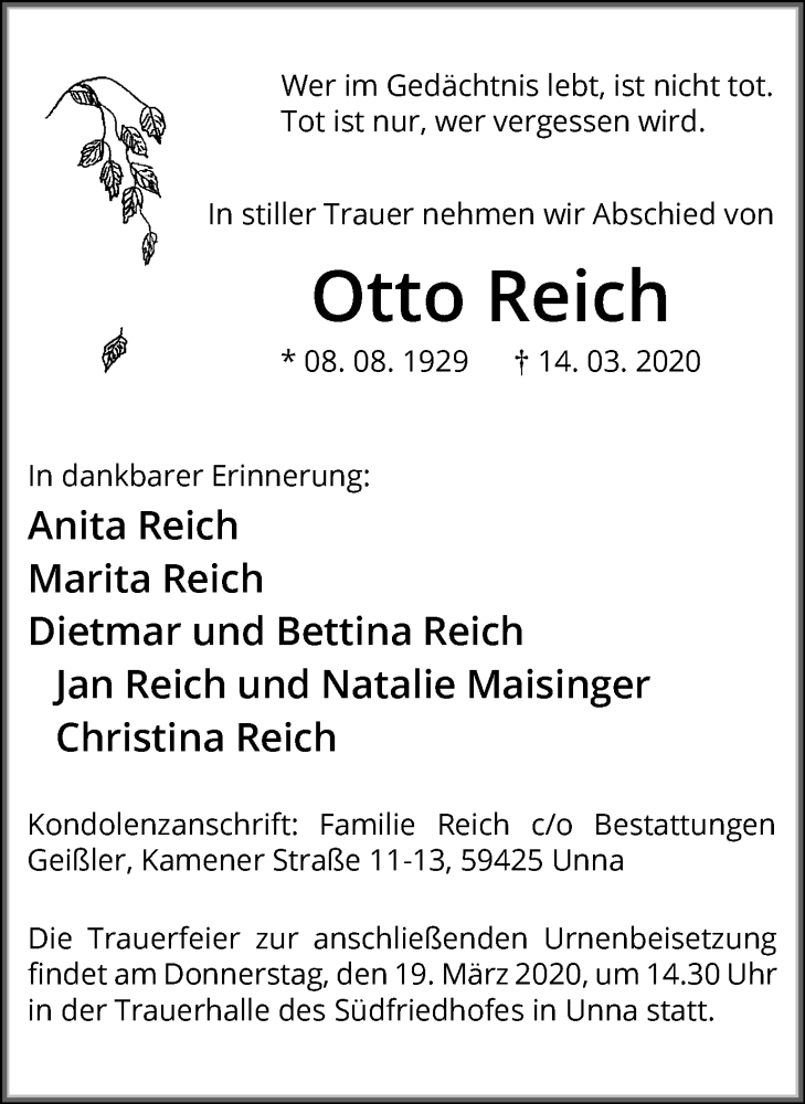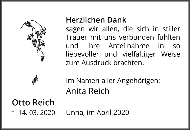 Hier finden Sie alle Traueranzeigen aus der Zeitung, die bisher für Otto Reich erschienen sind. Weitere Traueranzeigen, die in der Zeitung erscheinen, werden hier ebenfalls aufgelistet