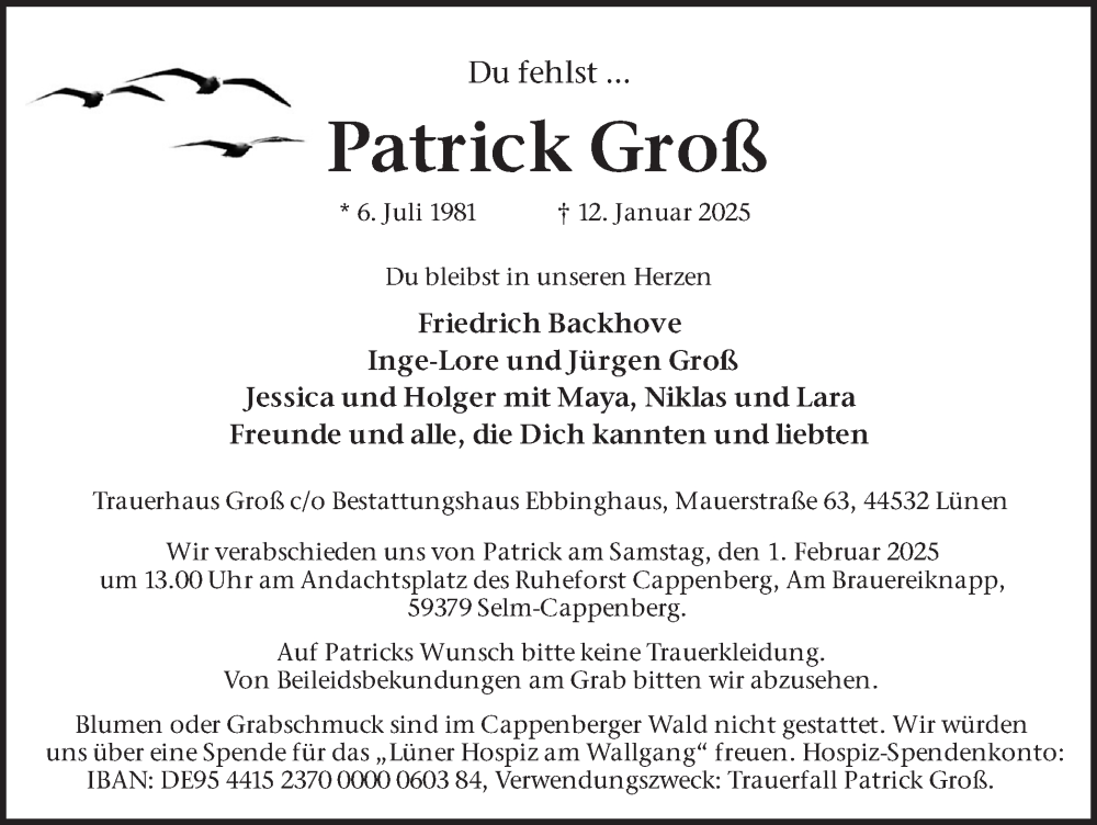 Hier finden Sie alle Traueranzeigen aus der Zeitung, die bisher für Patrick Groß erschienen sind. Weitere Traueranzeigen, die in der Zeitung erscheinen, werden hier ebenfalls aufgelistet