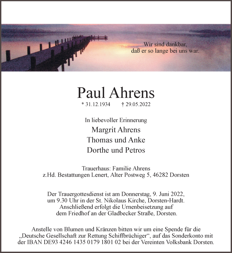 Hier finden Sie alle Traueranzeigen aus der Zeitung, die bisher für Paul Ahrens erschienen sind. Weitere Traueranzeigen, die in der Zeitung erscheinen, werden hier ebenfalls aufgelistet