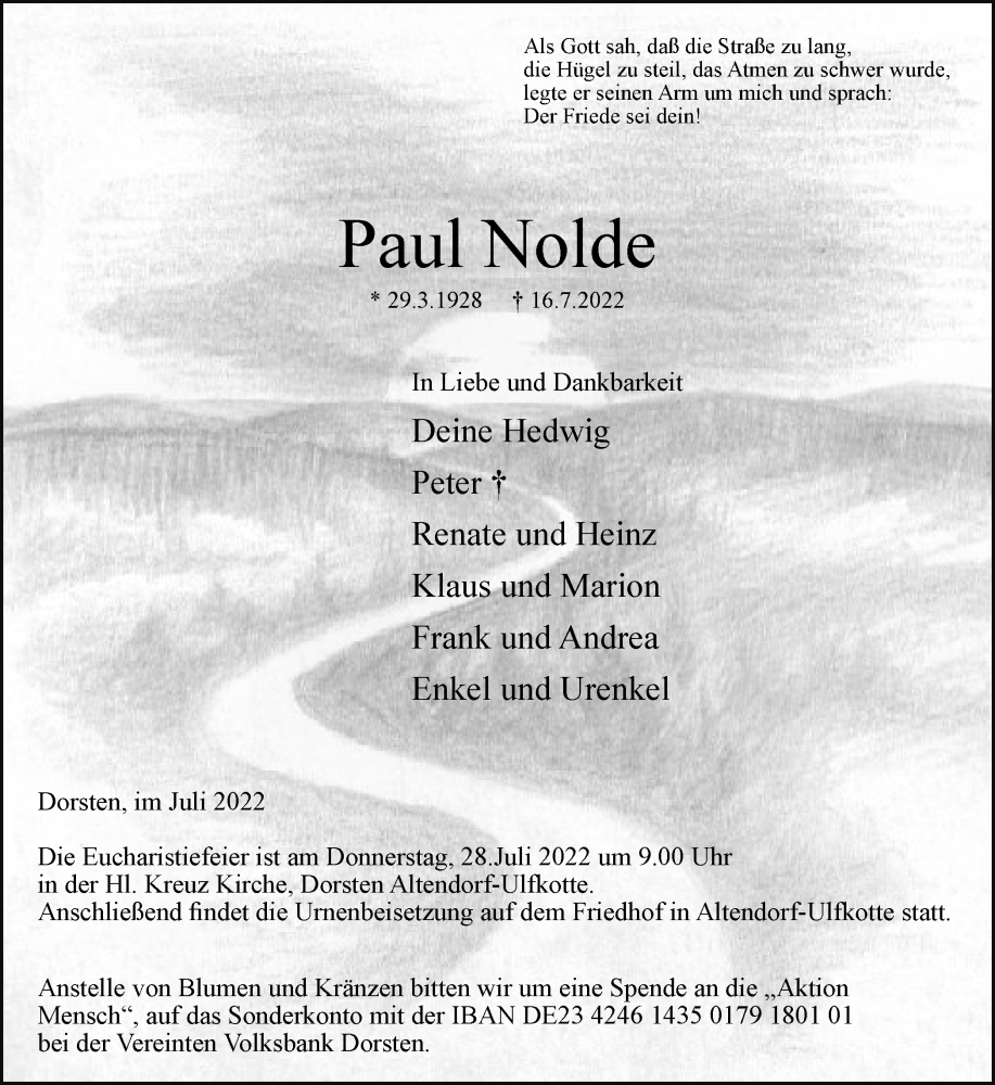 Hier finden Sie alle Traueranzeigen aus der Zeitung, die bisher für Paul Nolde erschienen sind. Weitere Traueranzeigen, die in der Zeitung erscheinen, werden hier ebenfalls aufgelistet