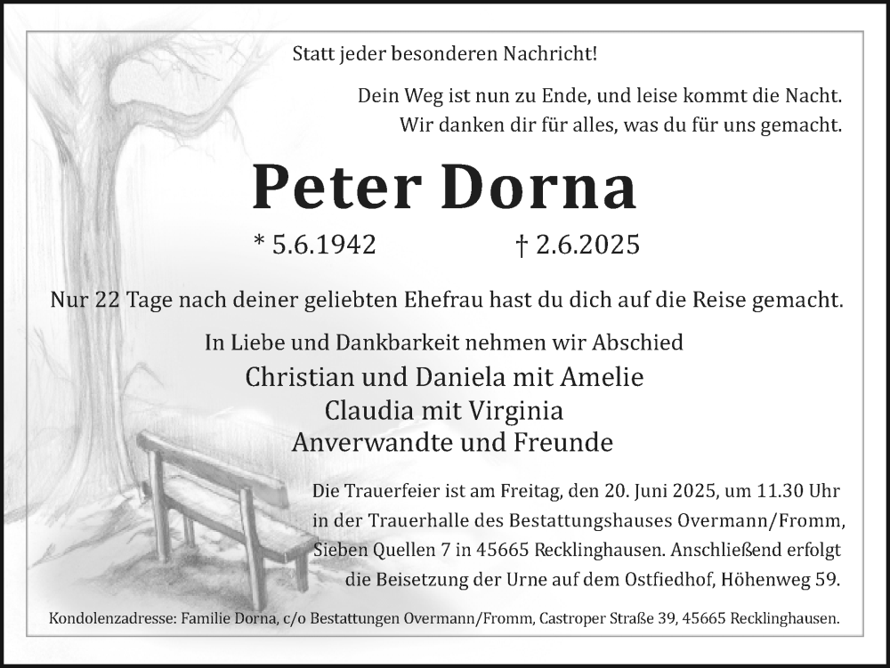 Hier finden Sie alle Traueranzeigen aus der Zeitung, die bisher für Peter Dorna erschienen sind. Weitere Traueranzeigen, die in der Zeitung erscheinen, werden hier ebenfalls aufgelistet
