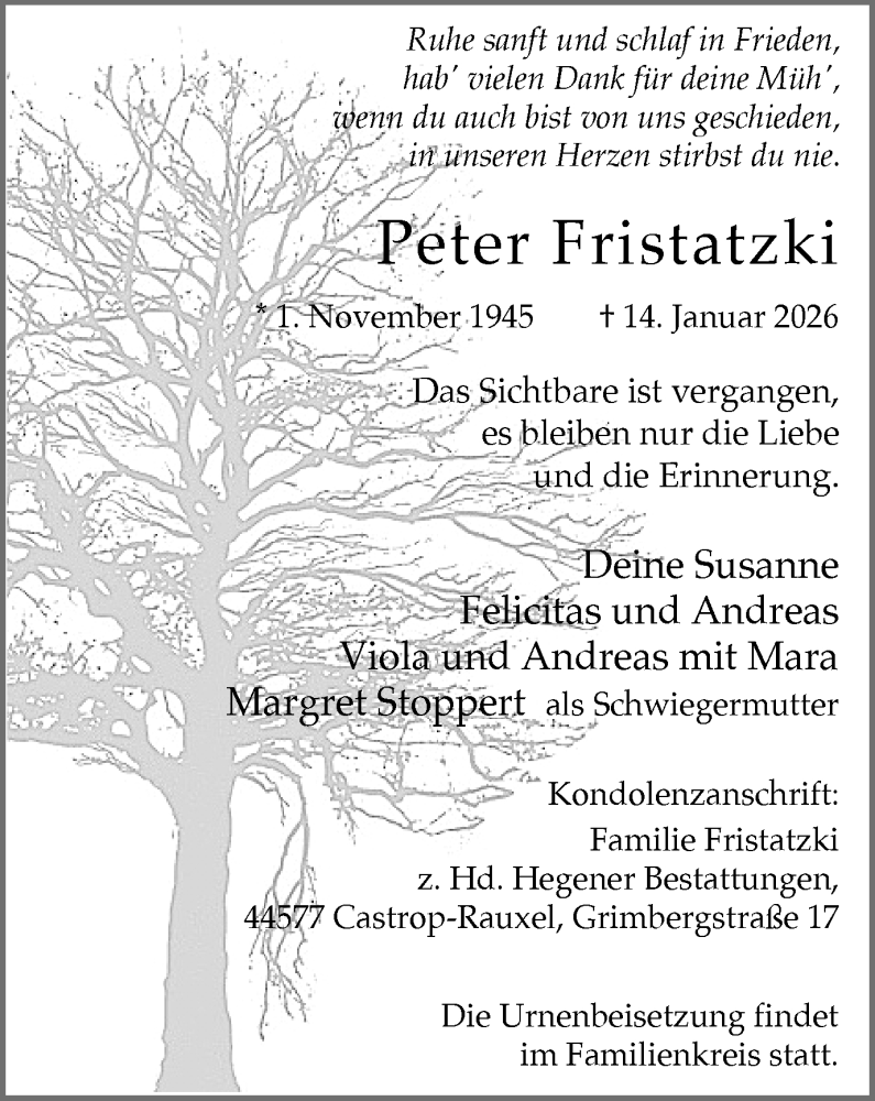 Hier finden Sie alle Traueranzeigen aus der Zeitung, die bisher für Peter Fristatzki erschienen sind. Weitere Traueranzeigen, die in der Zeitung erscheinen, werden hier ebenfalls aufgelistet