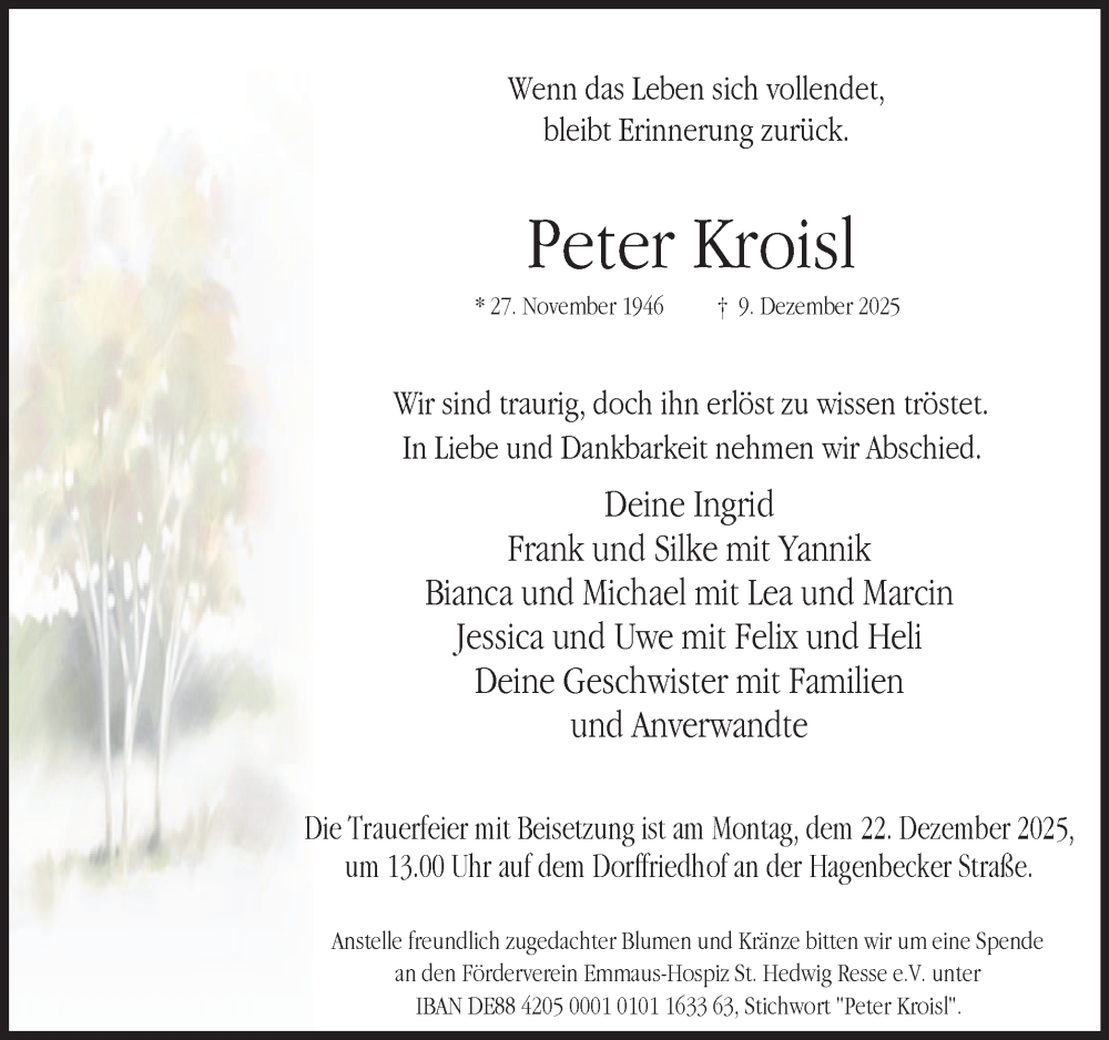 Hier finden Sie alle Traueranzeigen aus der Zeitung, die bisher für Peter Kroisl erschienen sind. Weitere Traueranzeigen, die in der Zeitung erscheinen, werden hier ebenfalls aufgelistet
