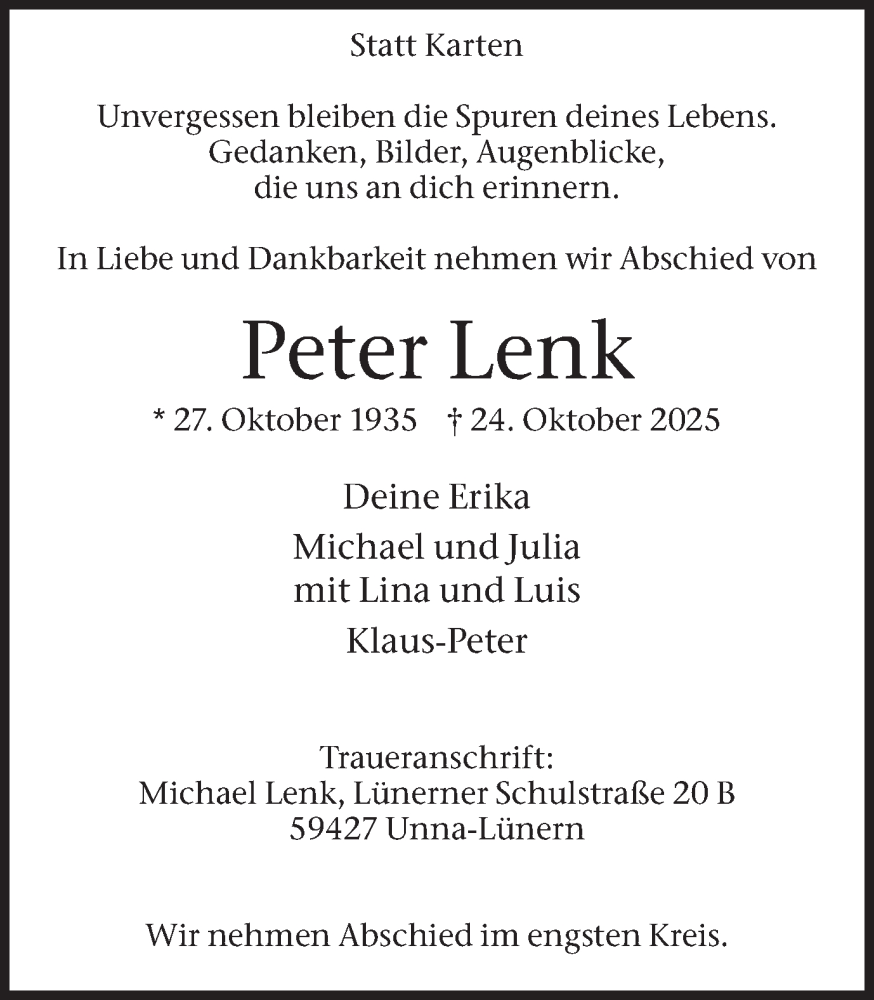 Hier finden Sie alle Traueranzeigen aus der Zeitung, die bisher für Peter Lenk erschienen sind. Weitere Traueranzeigen, die in der Zeitung erscheinen, werden hier ebenfalls aufgelistet