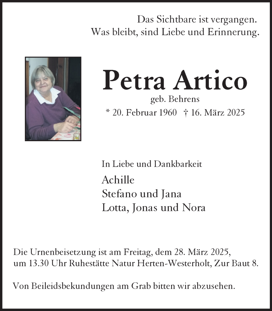 Hier finden Sie alle Traueranzeigen aus der Zeitung, die bisher für Petra Artico erschienen sind. Weitere Traueranzeigen, die in der Zeitung erscheinen, werden hier ebenfalls aufgelistet