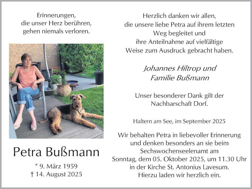Hier finden Sie alle Traueranzeigen aus der Zeitung, die bisher für Petra Bußmann erschienen sind. Weitere Traueranzeigen, die in der Zeitung erscheinen, werden hier ebenfalls aufgelistet