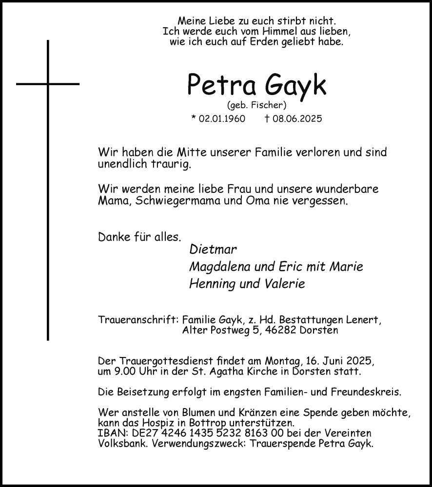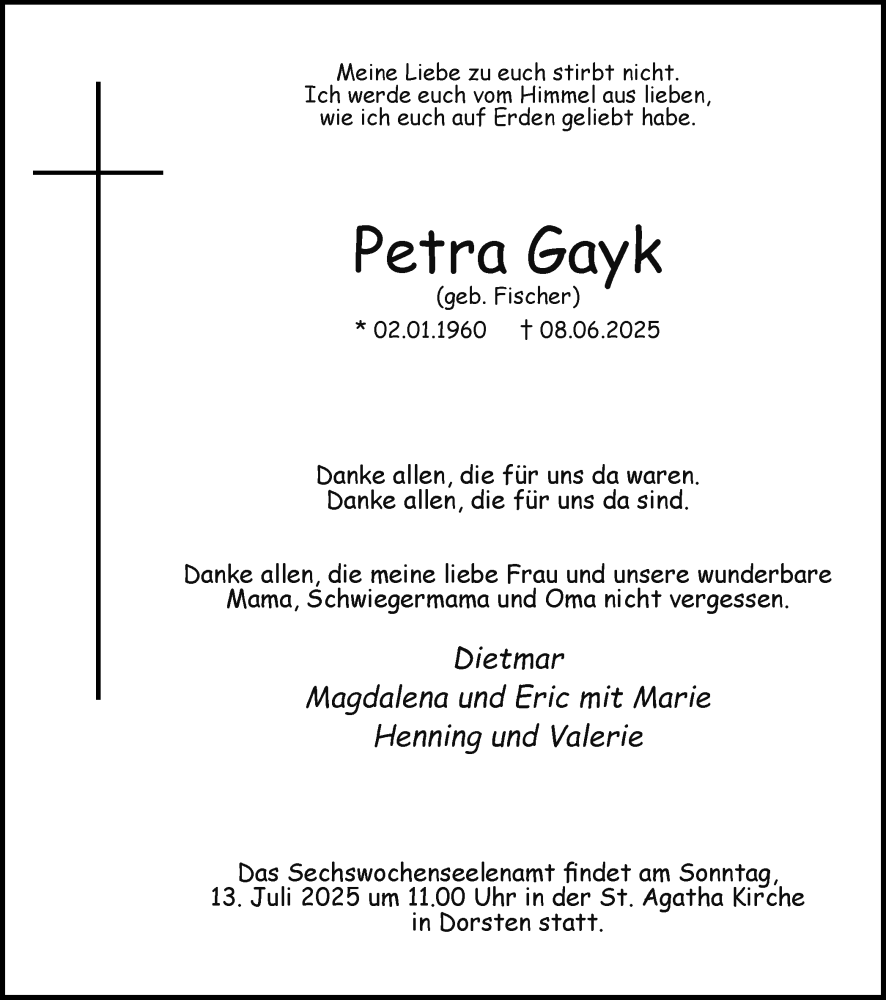 Hier finden Sie alle Traueranzeigen aus der Zeitung, die bisher für Petra Gayk erschienen sind. Weitere Traueranzeigen, die in der Zeitung erscheinen, werden hier ebenfalls aufgelistet