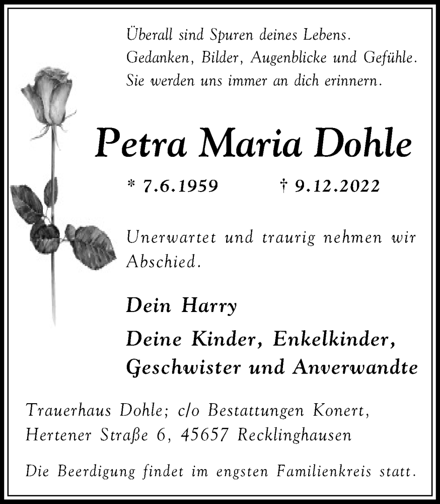 Hier finden Sie alle Traueranzeigen aus der Zeitung, die bisher für Petra Maria Dohle erschienen sind. Weitere Traueranzeigen, die in der Zeitung erscheinen, werden hier ebenfalls aufgelistet