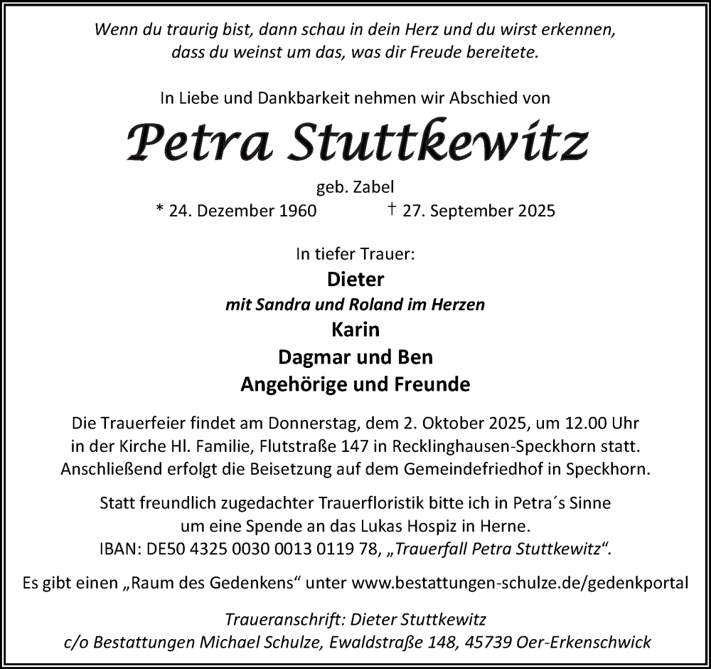 Hier finden Sie alle Traueranzeigen aus der Zeitung, die bisher für Petra Stuttkewitz erschienen sind. Weitere Traueranzeigen, die in der Zeitung erscheinen, werden hier ebenfalls aufgelistet