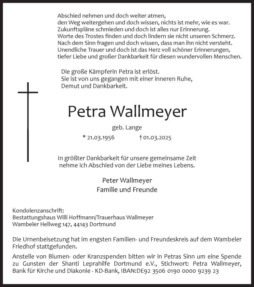 Hier finden Sie alle Traueranzeigen aus der Zeitung, die bisher für Petra Wallmeyer erschienen sind. Weitere Traueranzeigen, die in der Zeitung erscheinen, werden hier ebenfalls aufgelistet