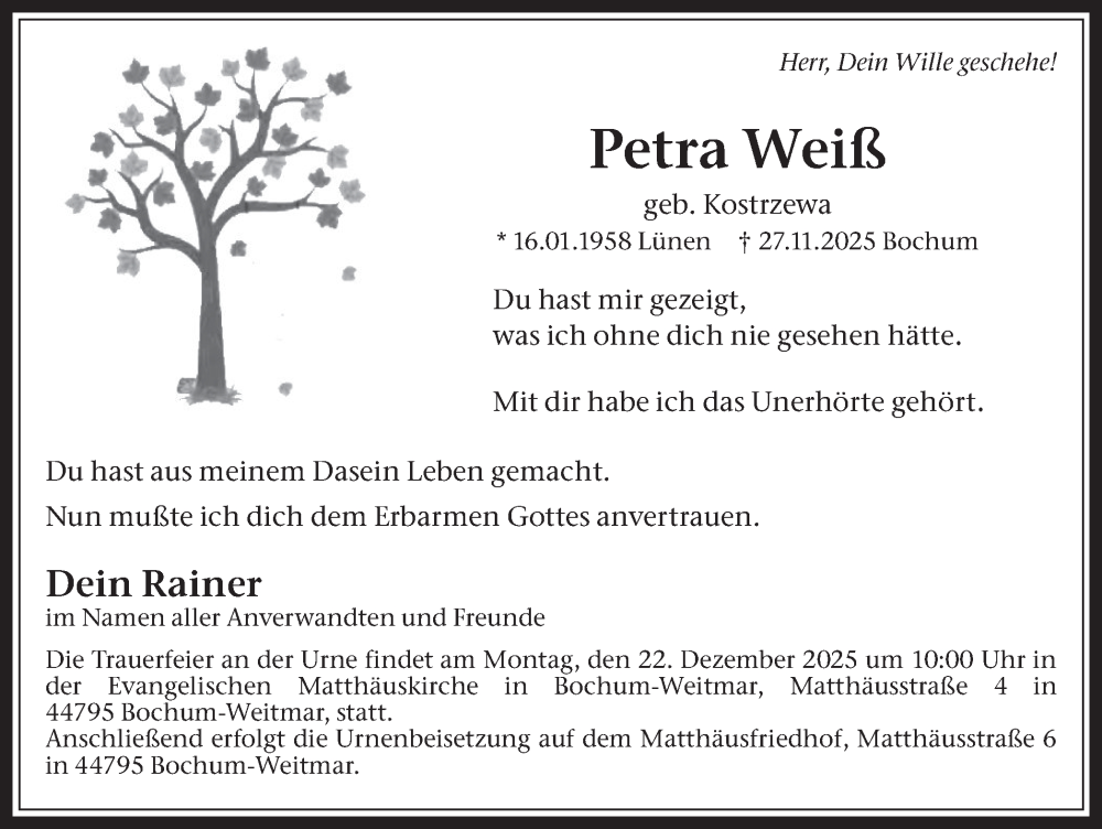 Hier finden Sie alle Traueranzeigen aus der Zeitung, die bisher für Petra Weiß erschienen sind. Weitere Traueranzeigen, die in der Zeitung erscheinen, werden hier ebenfalls aufgelistet