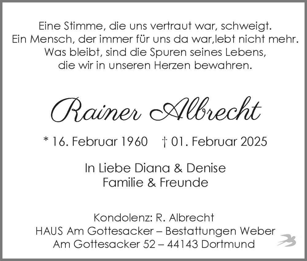 Hier finden Sie alle Traueranzeigen aus der Zeitung, die bisher für Rainer Albrecht erschienen sind. Weitere Traueranzeigen, die in der Zeitung erscheinen, werden hier ebenfalls aufgelistet
