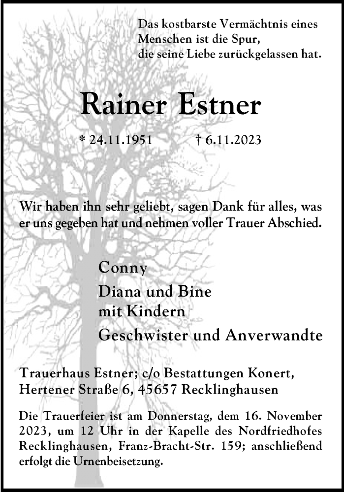 Hier finden Sie alle Traueranzeigen aus der Zeitung, die bisher für Rainer Estner erschienen sind. Weitere Traueranzeigen, die in der Zeitung erscheinen, werden hier ebenfalls aufgelistet