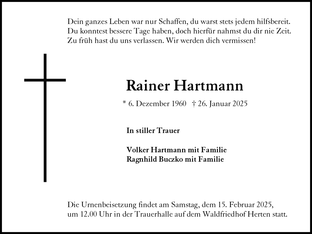 Hier finden Sie alle Traueranzeigen aus der Zeitung, die bisher für Rainer Hartmann erschienen sind. Weitere Traueranzeigen, die in der Zeitung erscheinen, werden hier ebenfalls aufgelistet
